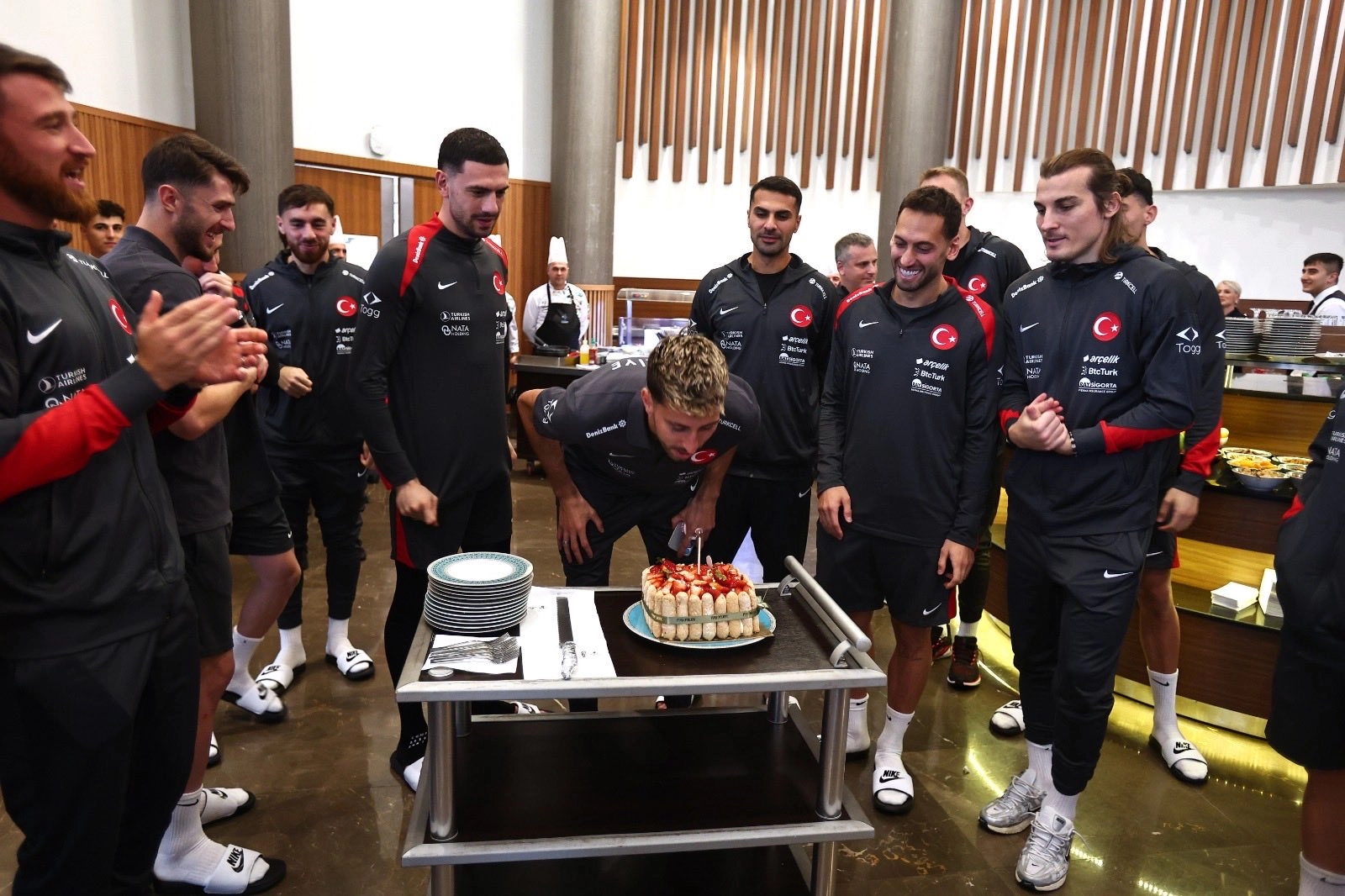 A Millî Takım’ın 2026 Dünya Kupası Avrupa Elemeleri için Riva’da kamp yaptığı sırada, aday kadroda yer alan oyuncumuz Atakan Karazor’un doğum günü coşkuyla kutlandı. Öğle yemeği sonrası hazırlanan pastayı kesen Atakan’a ilk dilimi kaptan Hakan Çalhanoğlu ikram etti.