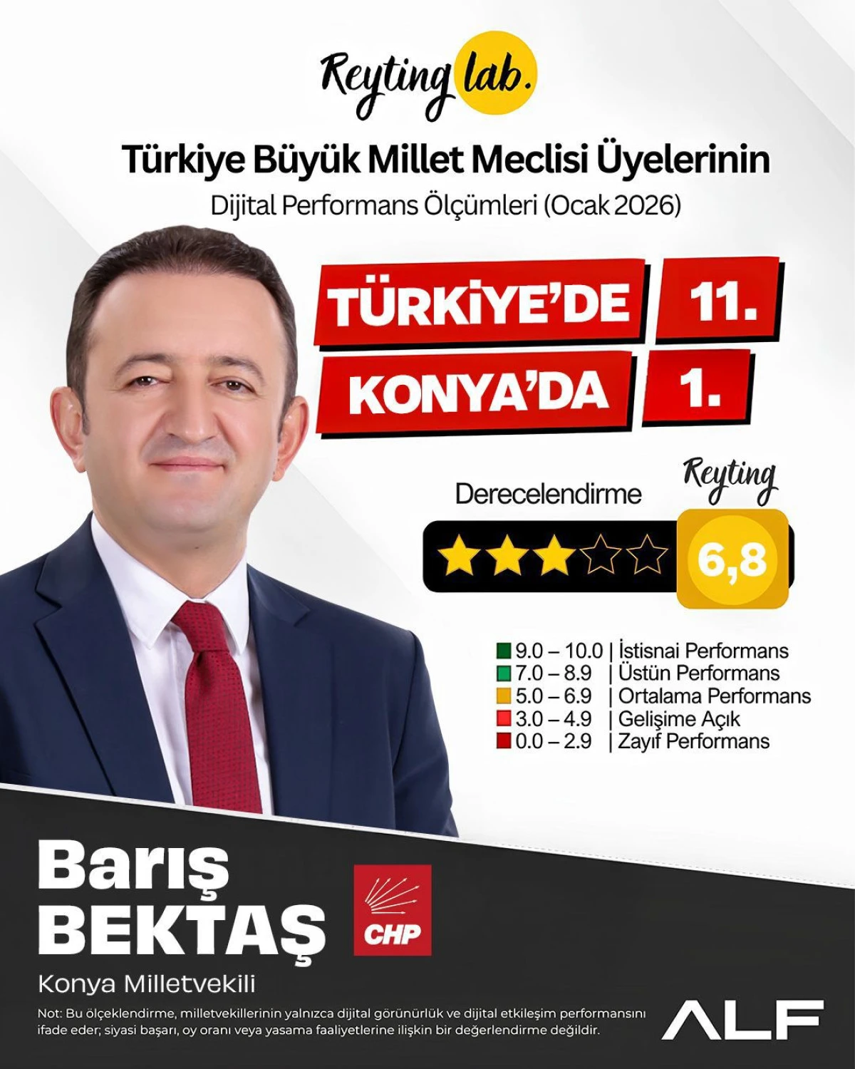 ALF Araştırma’nın 600 milletvekilinin dijital mecralarda görüntülenme, etkileşim, içerik kalitesi ve ortalama etkileşime göre yaptığı analiz çalışmasına göre CHP Konya Milletvekili Barış Bektaş Konya Milletvekilleri arasından 1’inci, 600 milletvekili arasından ise 11’inci oldu.
