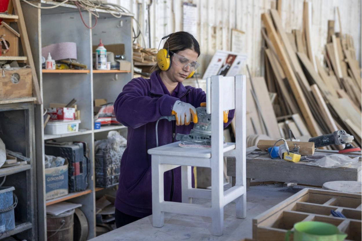 Mersin Büyükşehir Belediyesi Kadın ve Aile Hizmetleri Dairesi Başkanlığı’nda görev yapan Marangoz Ustası Teslime Özdemir, Tarsus Gençlik Kampı Geri Dönüşüm Atölyesi’nde 2020’den bu yana, birimlerin malzemelerini ürettiklerini anlatarak, “Birimlerimizden gelen ürünlerin bakım, onlarım ve tamir işlerini bu atölyede yapıyoruz. Geri Dönüşüm Atölyemizde; birimlerimizin ihtiyacı olan masa, sandalye, dolap ve büro malzemelerinden tutun, akla gelecek her türlü ihtiyacı üretiyoruz. 2020’den 2025 yılına kadar Daire Başkanlığımıza bağlı 40 birim açıldı. Bu birimlerden 38’inin malzemeleri burada üretildi. Diğer dairelerden gelen talepleri de elimizden geldiğince yerine getirmeye çalışıyoruz” ifadelerini kullandı.