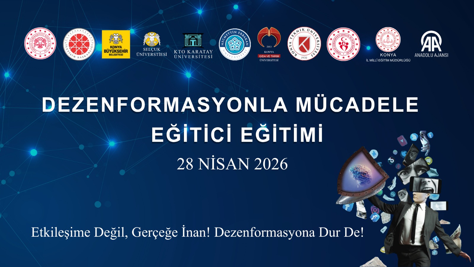 Cumhurbaşkanlığı İletişim Başkanlığı Dezenformasyonla Mücadele Merkezi ve İletişim Başkanlığı Konya Bölge Müdürlüğü tarafından organize edilen seminer, Konya Büyükşehir Belediyesinin ev sahipliğinde, 28 Nisan Salı günü saat 10.00’da Taş Bina Kültür ve Sanat’ta gerçekleştirilecek. Programa Konya, Aksaray ve Karaman’daki birçok kamu kurum ve kuruluşundan personelin katılması bekleniyor.