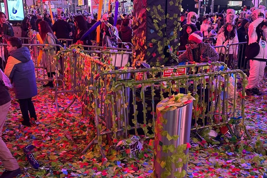 Times Meydanı’nda yeni yılın coşkusu bir yanda devam ederken, temizlenmesi gereken büyük bir atık yığını geride kaldı.